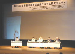 「地域生活支援の展望」をテーマに行われたシンポジウム(右写真)では、実際に地域のなかで生活支援に取り組んでいる専門家や当事者による事例発表や提言を通して、地域支援のあるべき姿や「支援費制度」の抱える課題などについて話し合われました。
