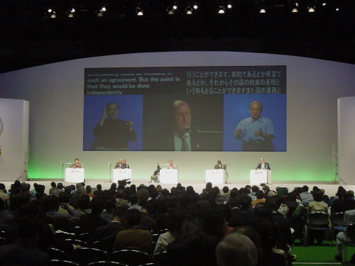 ▲「シンポジウムの様子。スクリーンには、英語、日本語の手話と字幕が映されている。」の大きい写真