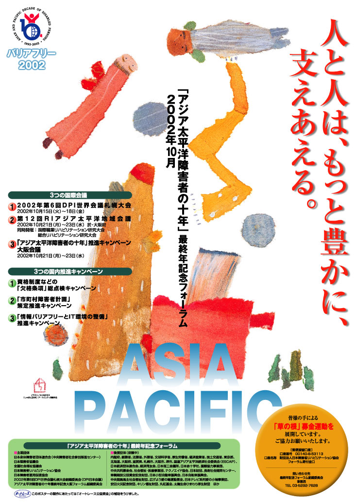 2002年はその最終年にあたります。これを記念して、日本を代表する主な障害者団体などの呼びかけにより、10月に、3つの大きな国際会議を札幌、大阪で開催しました。また、国際会議と併せ、国を挙げたキャンペーンも展開しました。 これらを「アジア太平洋障害者の十年」最終年記念フォーラムと総称します。 21世紀、障害のあるなしにかかわらず、ともに生き、ともにたすけ合う社会や生活環境の実現に向けた足掛かりとして、この「アジア太平洋障害者の十年」最終年記念フォーラムを、国民的な運動として展開いたしました。 皆さん一人ひとりのご理解、ご協力を感謝いたしします。 〒162-0052 東京都新宿区戸山1-22-1 戸山サンライズ内 TEL:03-5292-7628 FAX:03-5292-7630 | |||||||||||||||||||||||||||||